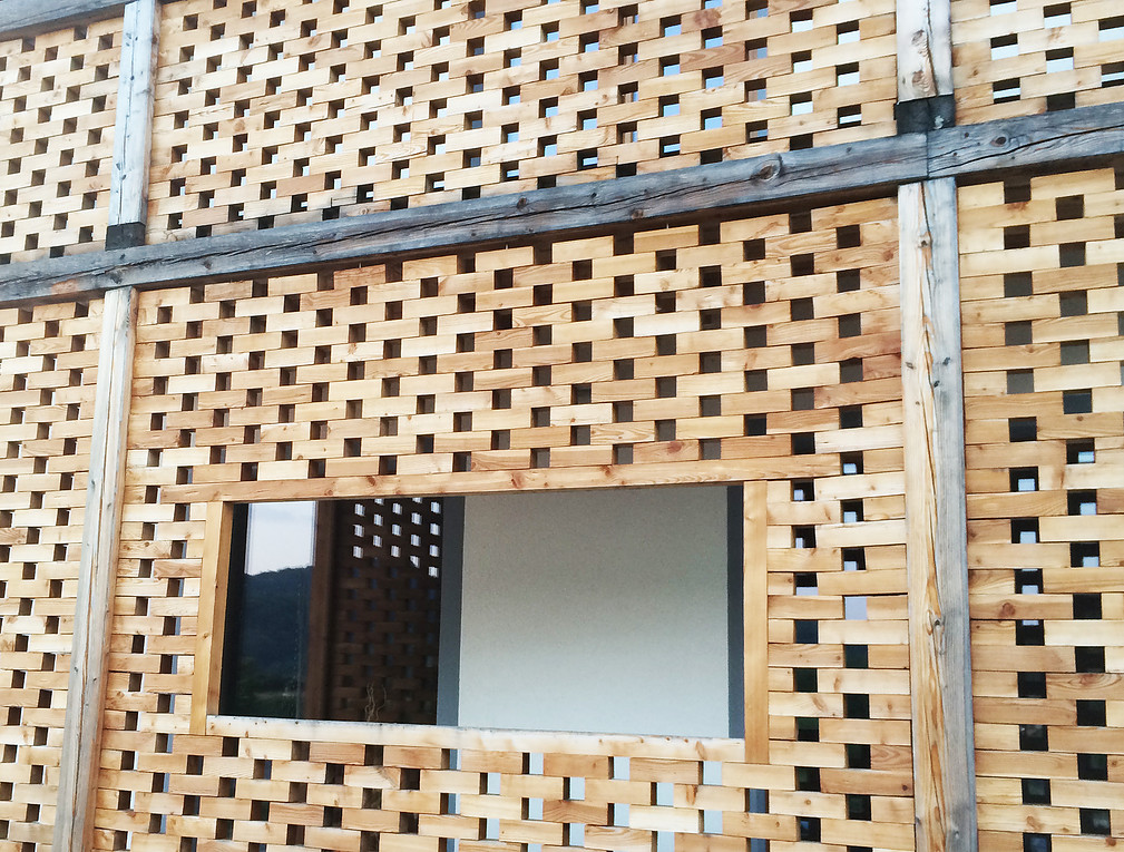 Končujemo prodajalno, kjer smo veliko eksperimentirali z različnimi tehnikami in materiali. Predvsem nam je bilo pomembno, da smo združili tradicionalne materiale in moderne tehnike. Lesena masivna fasada posnema zračne line na gospodarskih objektih, grajene na iz opeke. Lesena fasada je sestavlena iz lesenih plohov iz masivnega slovenskega macesna. Dimenzije plohov so vizualno podobne kot dimezije starega modula opeke, torej debeline 8 cm, globine 8 cm in dolžine okrog 16 cm. Leseni elementi so privijačeni eden v drugega in se nalagajo s prekrivanjem. Tako smo ustvarili razgibano fasado, ki bo z leti in sivenjem samo pridobivala na lepoti.