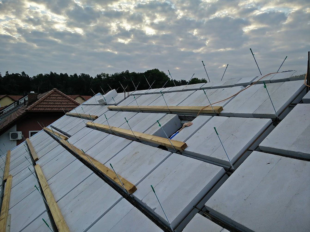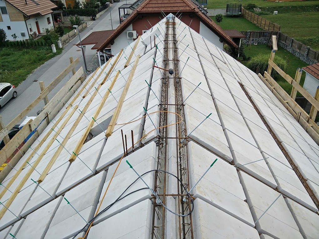 Izvedba strehe YTONG, modularni izolativni bloki iz porobetona povezani z armiranimi gredami, ki se zalijejo z betonom