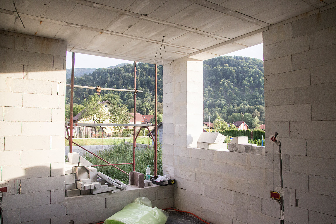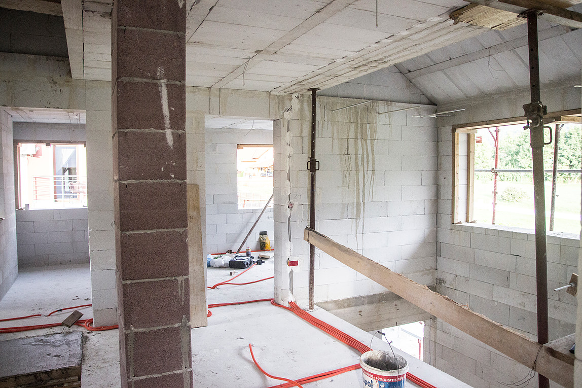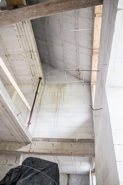Galerija nad dnevno sobo je povezovalni element med prostori. Vidne so navojne palice puščene iz Ytong gredic, kamor se bo montirala viseča mreža.