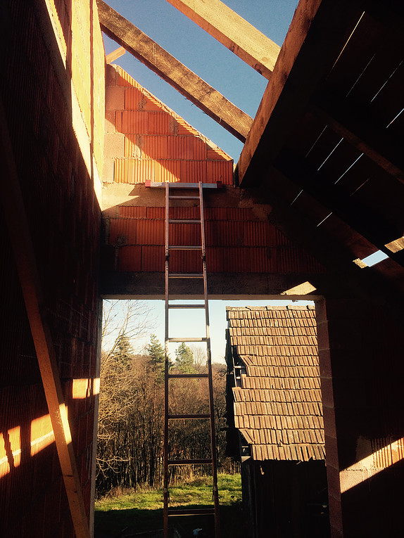Končan idejni načrt in pridobljeno gradbeno dovoljenje za moderno oblikovano hišo v okolici Maribora, ki ga je pripravil naš arhitekturni biro. Gradnja stanovanjske hiše se je z velikim zagonom pričela v juniju 2015. Do konca meseca je bila pripravljena temeljna ploča, nato so sledili YTONG zidovi. Nekaj je bilo težav s pridobivanjem izkušenih izvajalcev, vendar v tretje je investitorju uspelo najti zadovoljivo ekipo. Konstrukcijsko je zanimiva streha YTONG, ki je na sliki. Streho sestavljajo modularni bloki iz porobetona in vmesne gredi, ki se zalijejo z betonom. Pri takšni izvedbi dodatni špirovci niso potrebni, letve, kontraletve in kritina pa se položijo neposredno na konstrukcijo. Največji problem je pridobiti ustrezno dolge vijake za pritrjevanje kritine, ker sistemske rešitve Xella trenutno ne ponuja. V naslednjem tednu bo izvedena tudi kritina Gerard, kar bomo opisali v nadaljevanju.