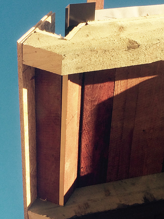 Cev žleba bo skrita za obrobo. Na sliki je vidna podkonstrukcija iz OSB plošč, ki jo bomo kasneje od znotraj zaščitili z SikaProof folijo, zunanjo stran pa z zaključno obrobo.